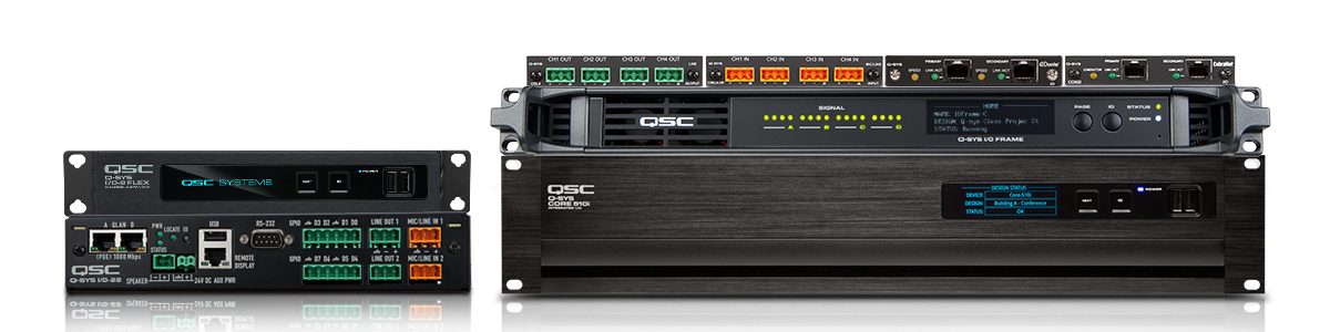 Los periféricos de E/S de Q-SYS ayudan a conectar la alimentación del procesador Q-SYS Core al mundo exterior del audio. Las tarjetas de E/S proporcionan conectividad a fuentes y destinos análogos y digitales, mientras que el I/O Frame y I/O-22 admiten entradas o salidas locales o remotas en cualquier lugar en que se encuentre disponible una red Gigabit Ethernet estándar con conectividad de regreso al Core.