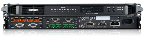 El I/O Frame de Q-SYS se puede utilizar para ubicar físicamente conexiones de entrada y salida cerca de sus fuentes y destinos. Cada I/O Frame cuenta con cuatro ranuras para tarjetas que pueden admitir hasta cuatro tarjetas de E/S mezcladas y emparejadas en cualquier combinación.