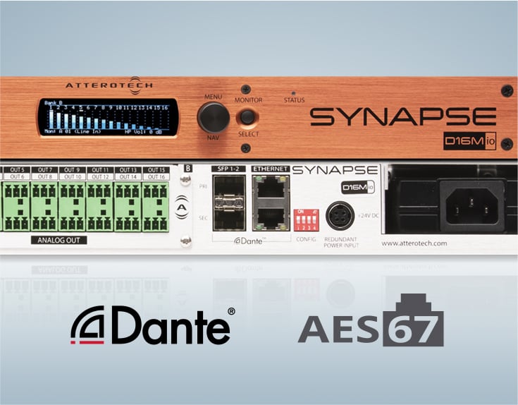 - Synapse D16Mio (discontinued) – Interface audio en réseau Dante/AES67 – 16 x entrées micro/ligne, 16 x sorties ligne