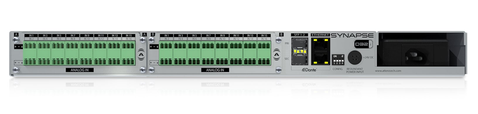 La Synapse D32i Attero Tech est une interface audio en réseau haute performance, compatible Dante™ avec interopérabilité AES67. La D32i dispose de 32 canaux d'entrées symétriques au niveau ligne, capables d'accueillir des appareils audio analogiques grand public et/ou professionnels au niveau ligne. Toutes les entrées sont disponibles indépendamment pour le routing à partir des interfaces audio en réseau Dante / AES67.