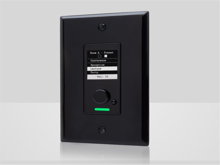 Solutions de contrôle flexibles sur IP pour les systèmes audiovisuels en réseau, encastrable 1 poste de style Decora®, un écran OLED et un bouton rotatif.