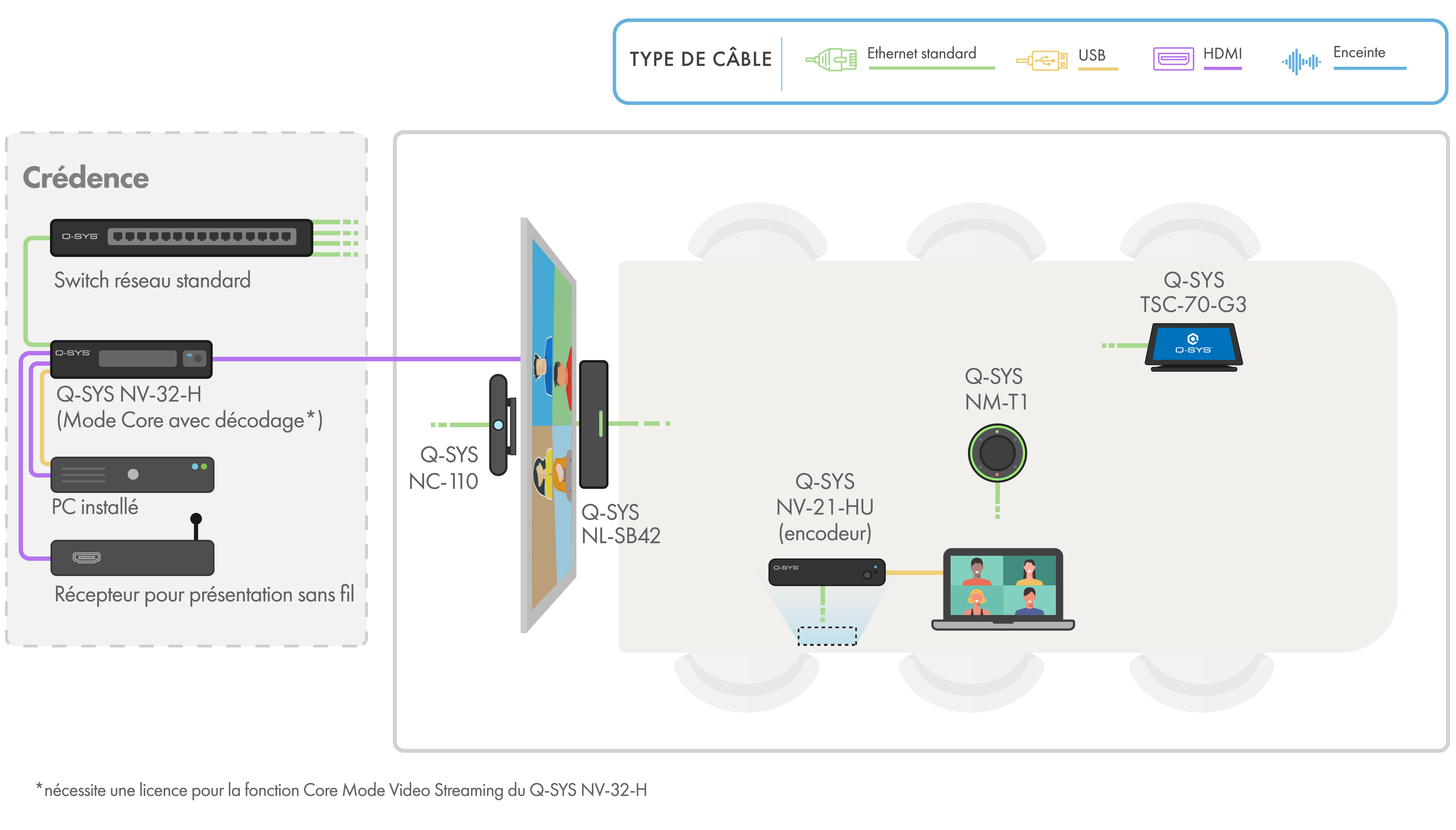 Le ’Mode Core’ active un switch vidéo HDMI 3 x 2 intégré, ce qui permet aux utilisateurs dans les salles de partager facilement du contenu à partir de leurs ordinateurs portables ou d'autres appareils. La licence de fonctionnalités additionnelles Core Mode Video Streaming permet l’encodage ou le décodage via Q-SYS Shift™.