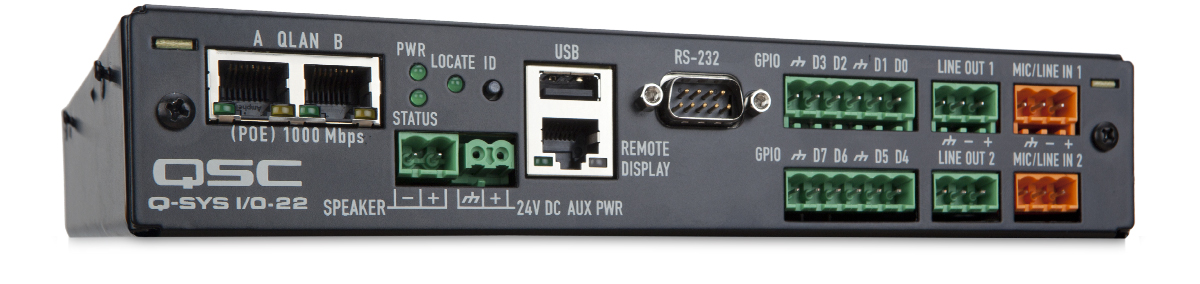 Le Q-SYS™ I/O-22, est une unité autonome et compacte conçue pour être utilisée lorsque les sources audio et les destinations d’un réseau Q-SYS™ sont physiquement séparées, comme par exemple les sièges individuels dans un système de sonorisation de conférence ou les différentes pièces d’un lieu avec de multiples salles. Fournissant deux entrées micro/ligne et deux sorties ligne, le I/O-22 est parfait pour des applications dans une assemblée, un tribunal, une salle de réunion, une salle de bal, des zones connexes, salles de classes, suites VIP et comme patch sur scène.
