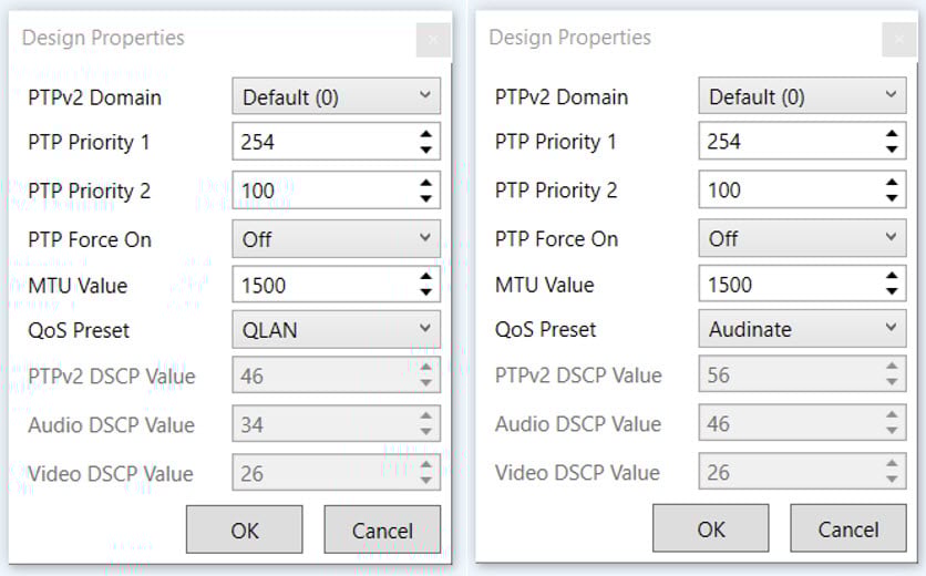 프로젝트 유형에 올바른 Q-SYS DSCP 설정 을 선택했는지 확인합니다(Q-LAN만 해당, Q-LAN + Dante 또는 사용자 지정 QoS 값). 시간에 민감한 미디어 트래픽을 통과해야 하는 모든 스위치와 스위치 포트에 이러한 QoS 값이 구성되어 있는지 확인합니다.