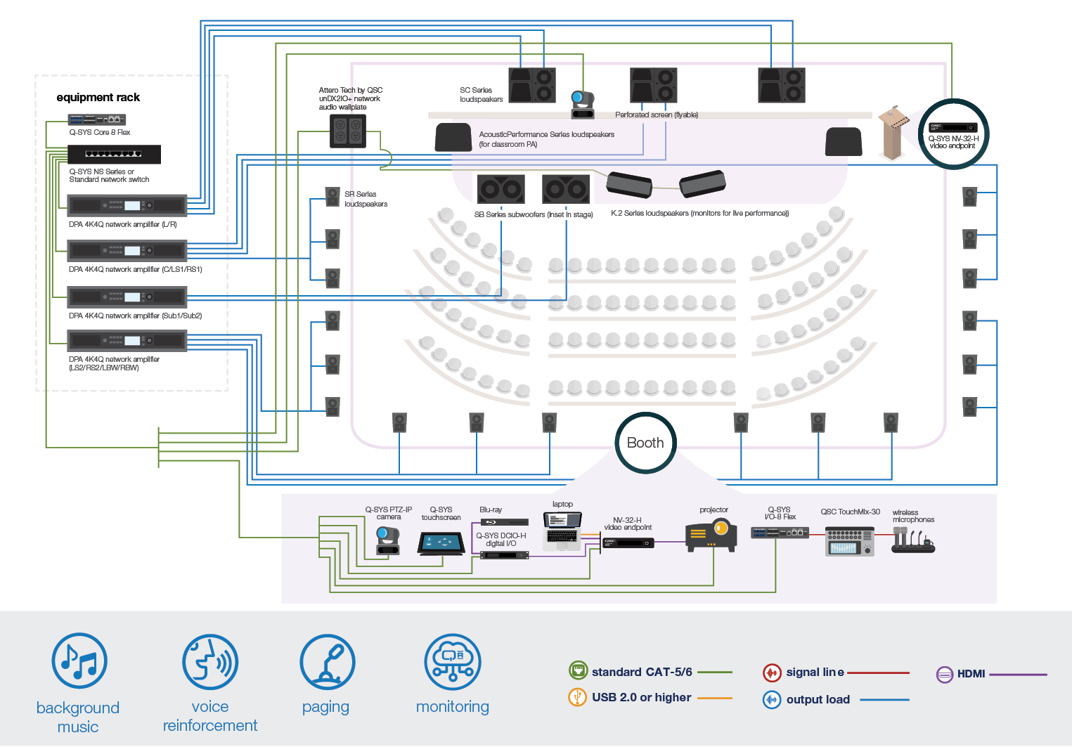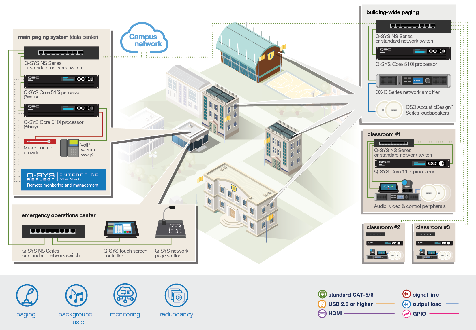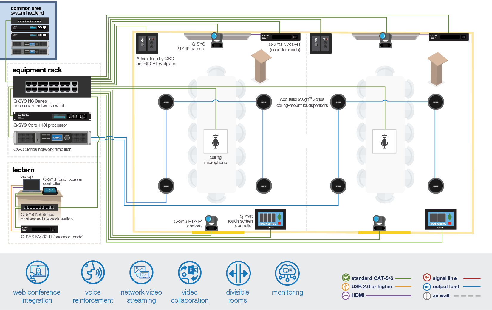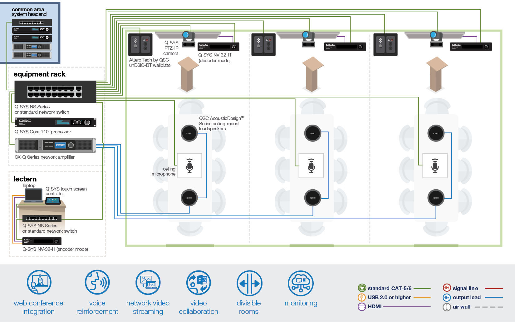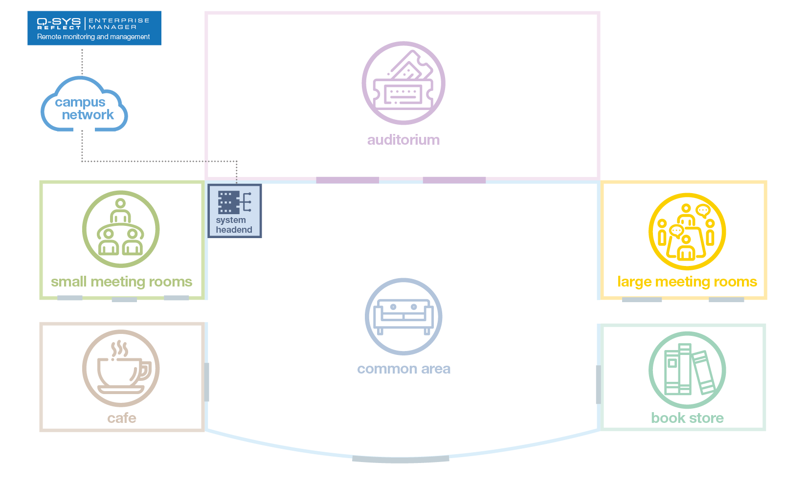 Q-SYS는 완전히 통합된 소프트웨어 기반 오디오, 비디오 & 제어 플랫폼으로 캠퍼스 전체에서 구성을 사용할 수 있습니다. 소규모 강의실과 하이브리드 학습 환경부터 대규모 강의실과 공연장까지, Q-SYS는 학생과 교담당자 모두에게 직관적인 경험을 제공합니다.