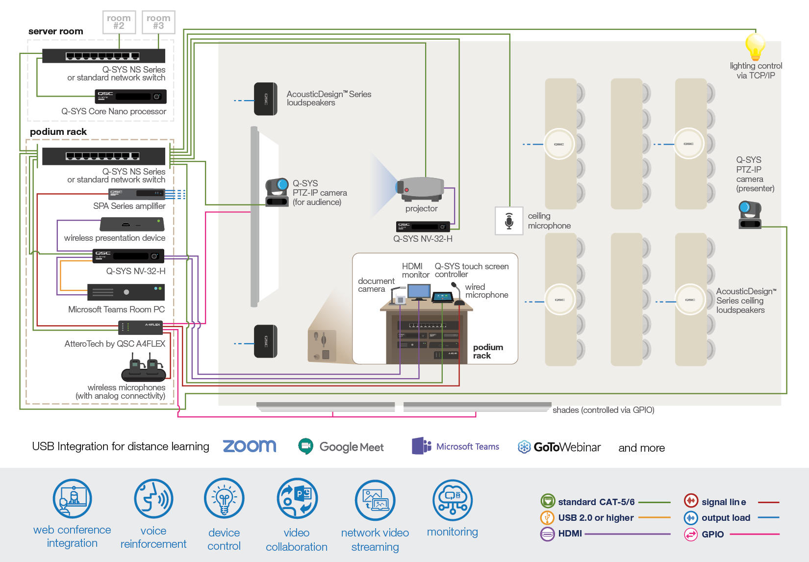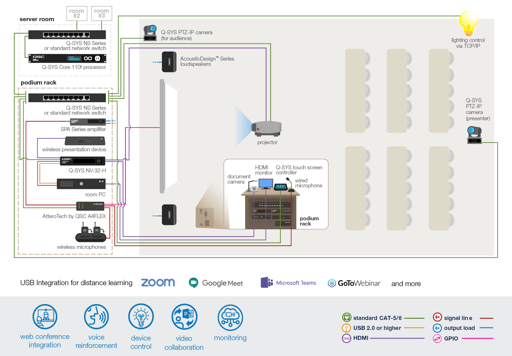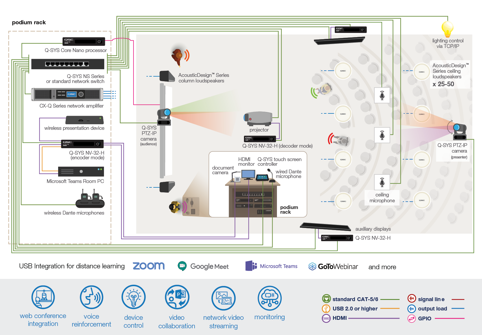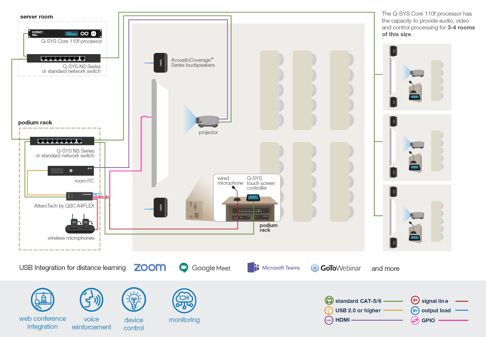 수업을 원하는 플랫폼에 연결하세요! Q-SYS는 드라이버가 필요 없는 단일 USB를 통해 Zoom 및 Microsoft Teams를 포함한 모든 최신 소프트 회의 구성을 통합합니다. 자세히 알아보기