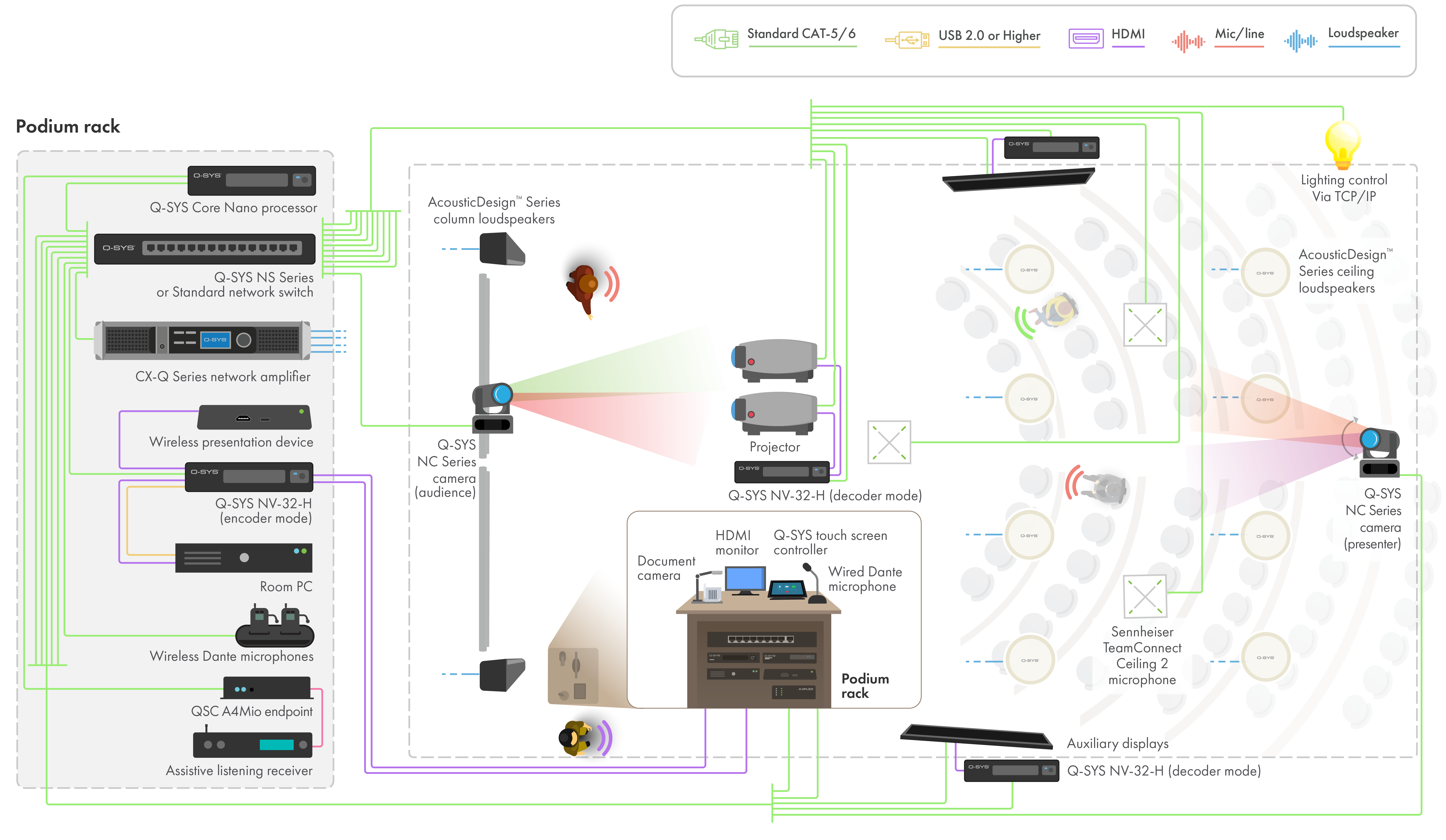 넓은 강의실에서는 발표자의 콘텐츠를 실내 디스플레이로 쉽게 전달할 수 있는 방법이 필요합니다. Q-SYS는 추가 HDMI 연장기, 제어 프로세서, 브리지 또는 복잡한 프로그래밍 없이도 PC 및 문서용 카메라의 HDMI 비디오와 오디오를 실내 곳곳의 LED 디스플레이, 프로젝터, 개별 모니터로 전송합니다. 자세히 알아보기