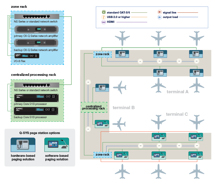 Q-SYS 에코시스템은 중차대한 설치를 위한 전체 시스템 이중화 뿐만 아니라 중요한 비디오 및 오디오를 IT 친화적으로 배포하는 공항 전관방송 시스템을 제공합니다. 또한 이 아키텍처는 SimpleWay와 같은 메시징 시스템과의 완벽한 통합과 같은 향상된 기능을 제공하면서도 공항 관리자가 실시간 안내 방송으로 사전 녹음된 메시지를 재정의할 수 있도록 합니다. QSC는 또한 전관방송 스테이션 주변기기를 완벽하게 보완합니다. Q-SYS의 통합된 모든 기능을 갖춘 제어 엔진은 메시지 조합부터 비디오 사이니지 배포 등에 이르기까지 거의 모든 IP 기반 타사 장치를 제어할 수 있습니다. 마지막으로, QSC는 모든 인클로저 유형(벽부형, 펜던트, 실링, 기둥, SUB/SAT)에서 완벽한 오디오 확성 역할을 하는 완벽한 라우드스피커 포트폴리오를 제공합니다.