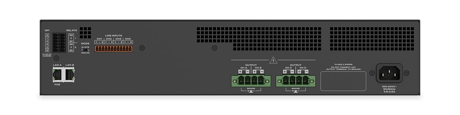 - 아날로그, 라인 레벨 오디오 입력 4개, Q-SYS 또는 직접 출력으로 전체 라우팅 가능
