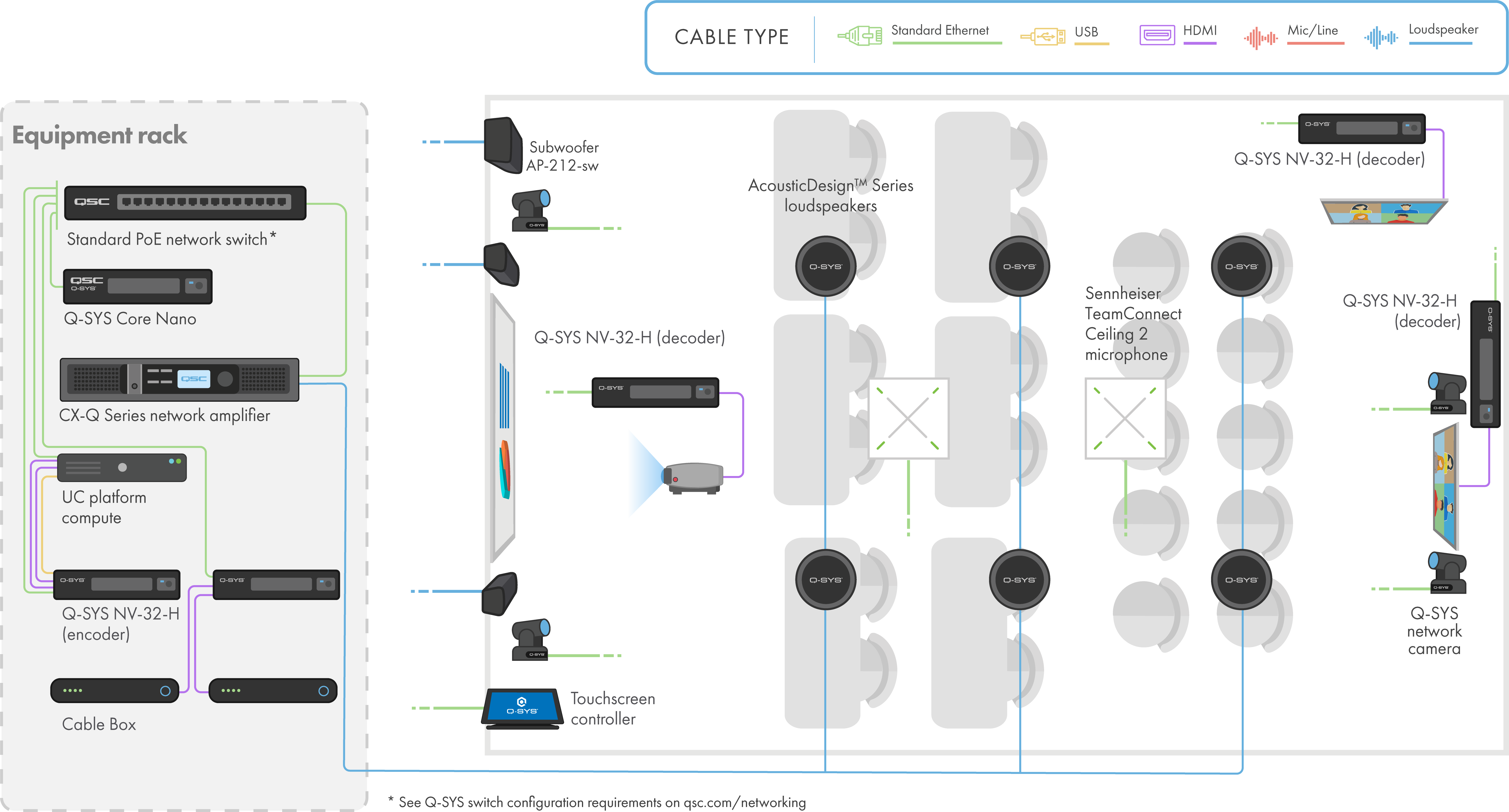 새로운 Q-SYS PoE 라우드스피커와 마이크를 활용하세요. 별도의 앰프가 필요 없고, 스피커를 튜닝할 필요도 없으며, 마이크 상태 표시등을 위한 추가 배선도 필요 없습니다. PoE 네트워크 스위치에 연결하기만 하면 됩니다.