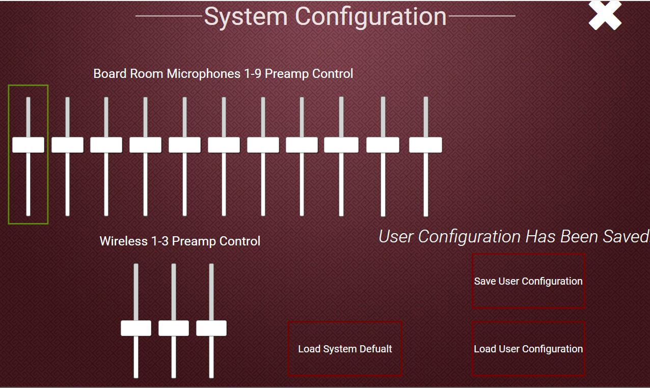 시스템을 원격으로 설치하려면 이전에 회의실에 설치된 앰프 및 라우드스피커와 통합하려면 Q-SYS 시스템을 최적화해야 했습니다. 현장에서 적절한 게인 스테이징을 보장하기 위해 퍼포먼스 오디오는 Q-SYS UCI 편집기를 사용하여 '시스템 구성' 사용자 제어 인터페이스(UCI)를 구축했습니다. VPN을 통해 연결한 후 마이크 Gain trim 보드 및 회의실 최대 오디오 레벨을 설정하는 등 공간의 적절한 오디오 레벨을 설정하는 동시에 UCI를 실시간으로 조정하여 최종 사용자를 안내했습니다. 이를 통해 최종 사용자는 회의실의 오디오를 통해 일상적인 업무에 사용할 수 있다는 더욱 편안함을 누릴 수 있었습니다. 회의 요구에 맞게 볼륨 제어, 마이크 선택 및 오디오 녹음을 가능하게 하는 UCI를 만들었습니다. 이 두 UCI는 모두 Q-SYS 네트워크에 배포되어 사용자가 단일 창에서 모든 것을 제어할 touch screen controller 있습니다.