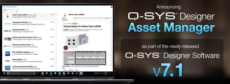 Costa Mesa, Calif. (August 1, 2018) – [De, Es, Fr] – QSC announces the addition of Q-SYS Designer Asset Manager as part of the latest release of Q-SYS Designer Software v7.1. This new cloud-based feature allows system designers to quickly and easily download and install new Q-SYS assets, including plugins for third-party device control, all without having to wait for new Q-SYS Designer Software releases.