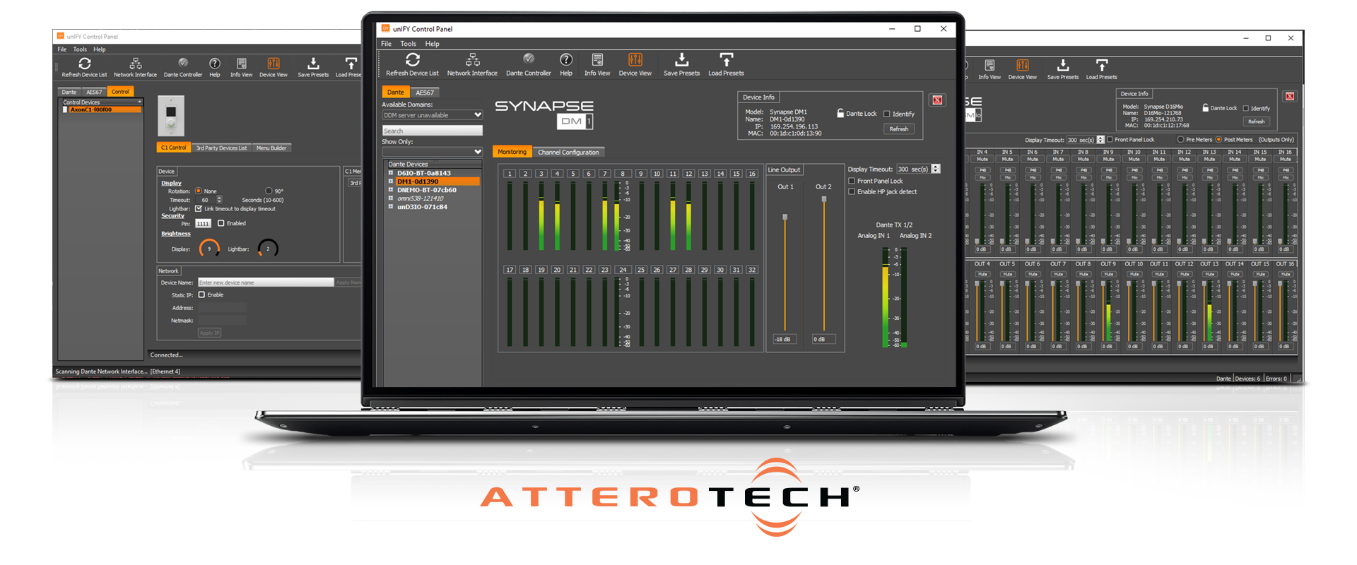 unIFY breakout 소프트웨어는 사용자에게 Attero Tech 기기를 monitor 하고 구성 simple 도구를 제공합니다. 구성된 네트워크에 연결된 장치를 자동으로 감지하여 장치 목록에 표시합니다. 기기가 검색되면 unIFY에서 기기에 대한 자세한 내용을 제공할 수 있습니다. Attero Tech 장치의 경우 unIFY는 게인 및 팬텀 파워와 같은 장치 설정을 구성하는 데도 사용됩니다.